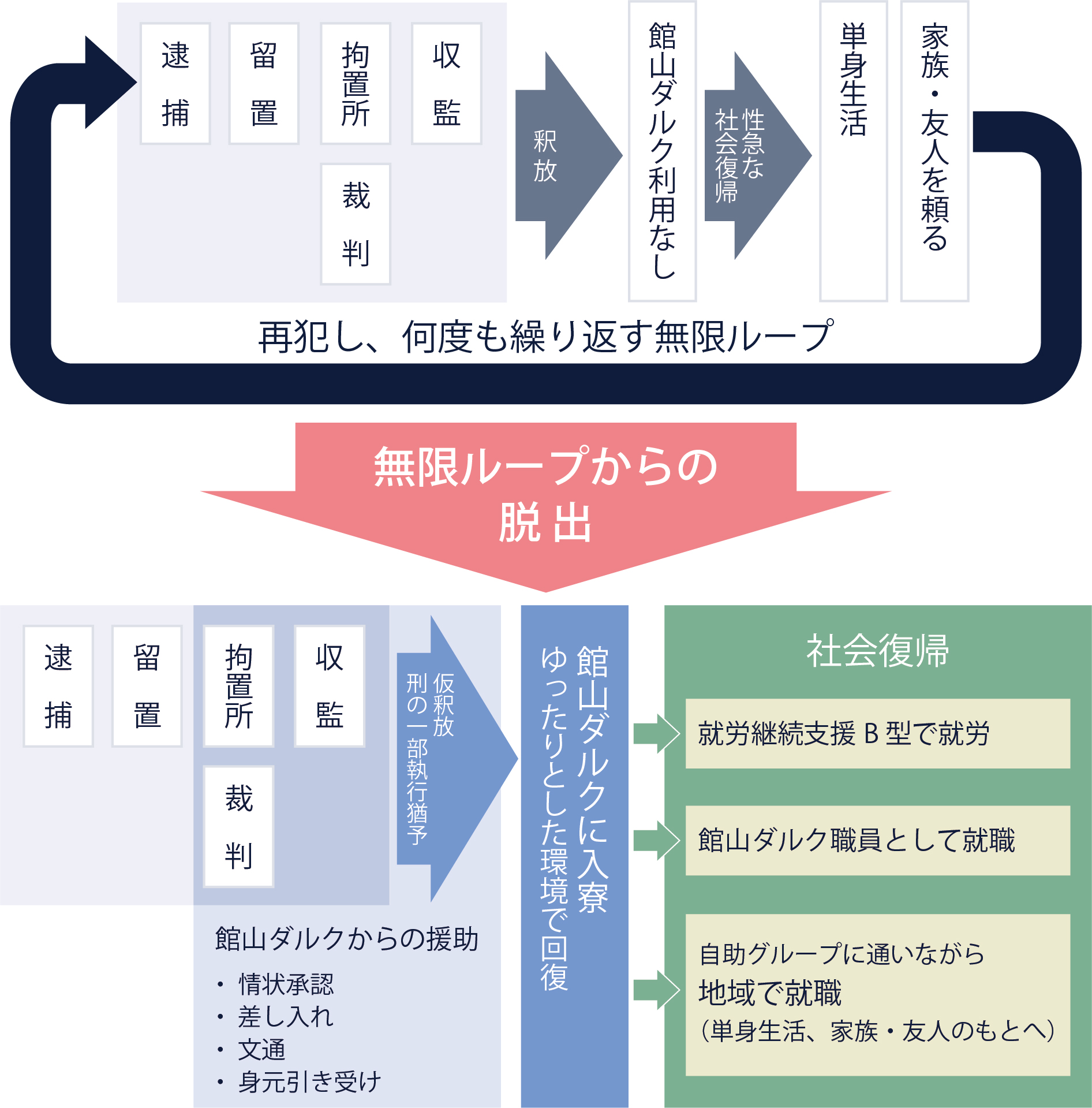 体質を変えることはできませんが、環境を変えることで依存症は回復できます。回復を続けることで無限ループから脱出し、社会復帰することができるのです。